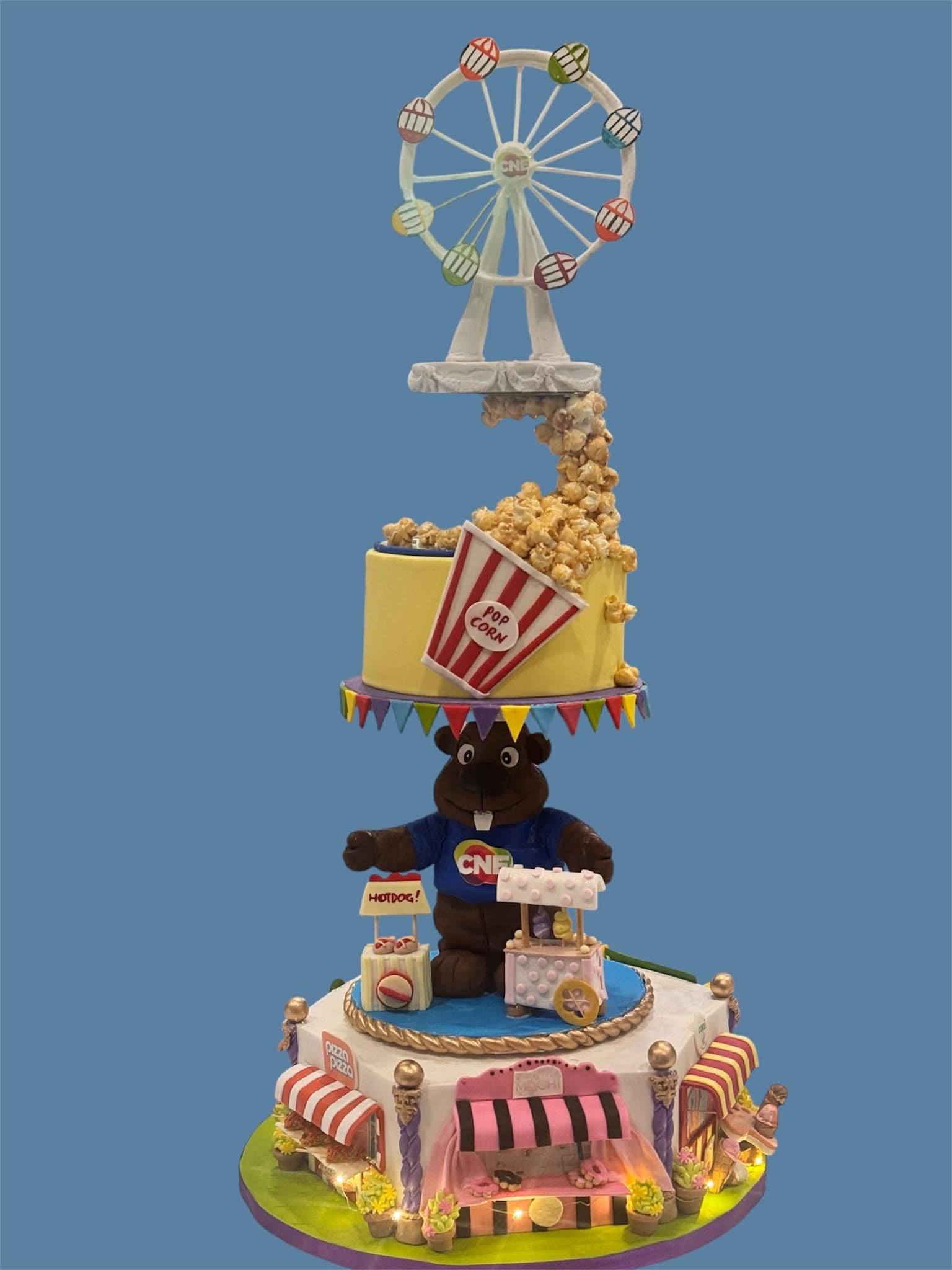 But the showpiece was the design, a gravity-defying tribute to the CNE midway itself. Each tier was transformed into an edible miniature food stall replica, highlighting the joy of wandering through the fairgrounds: