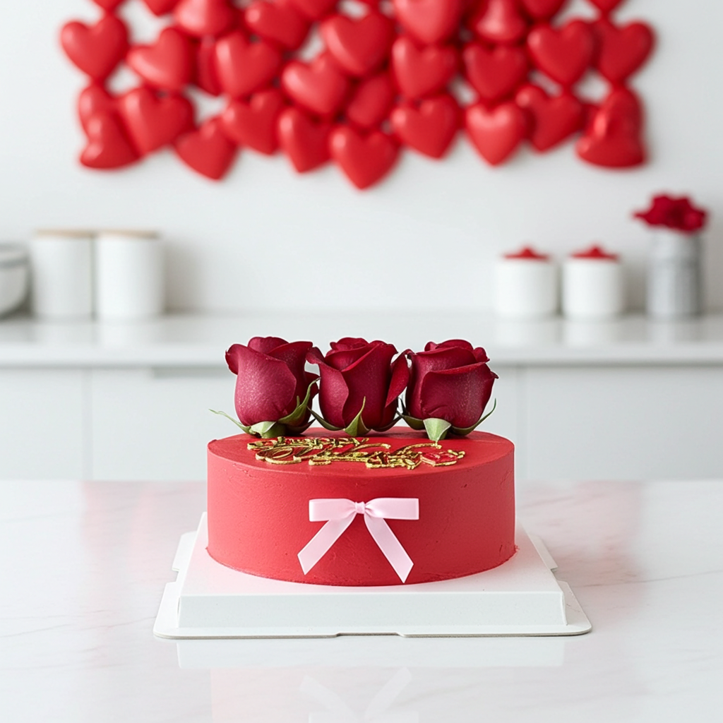 A romantic semi circle cake finished in smooth red buttercream and crowned with elegant rose blooms. Accented with a delecate ribbon and luxe gold valentine lettering. This cake is designed to make a statement, perfect for Valentine's Day!